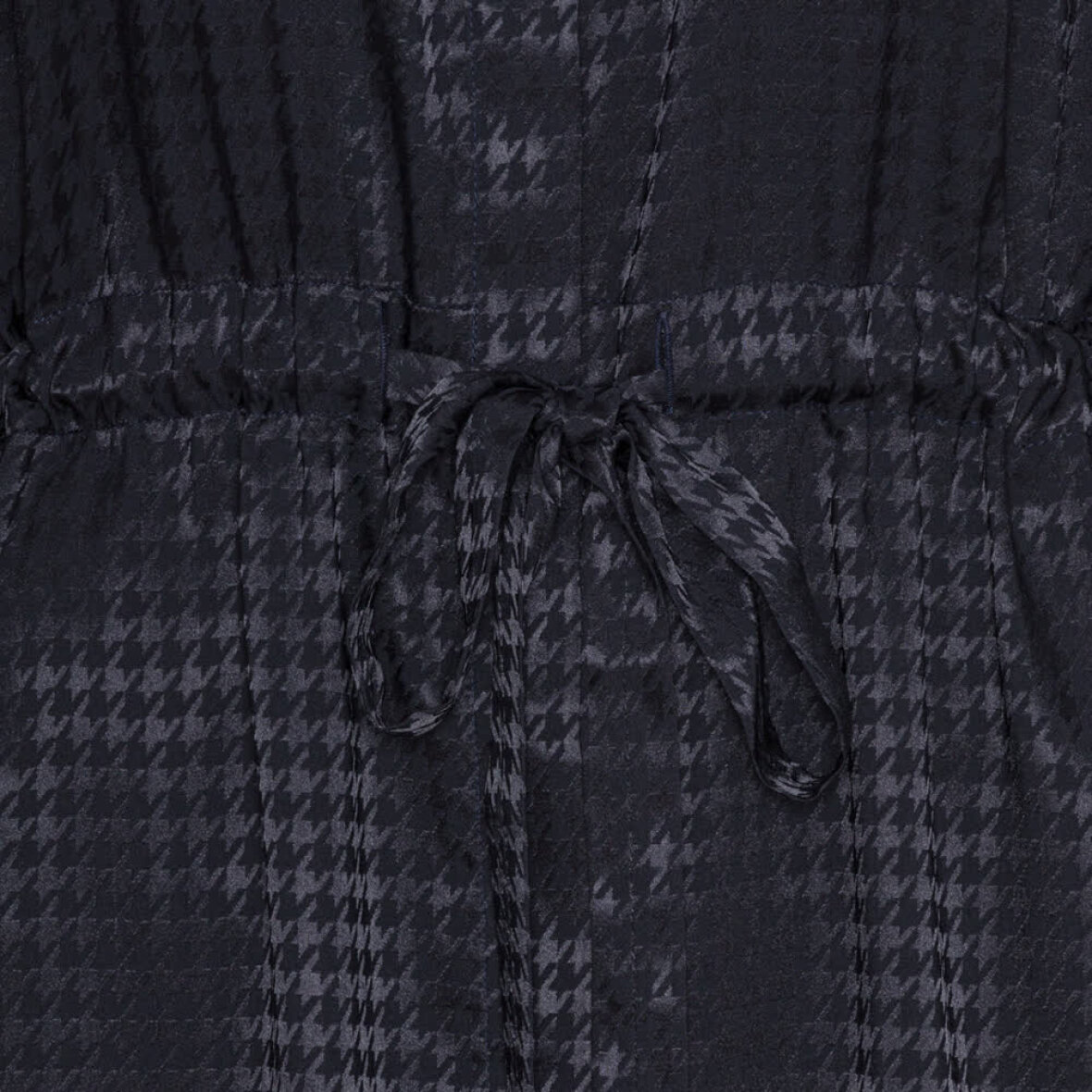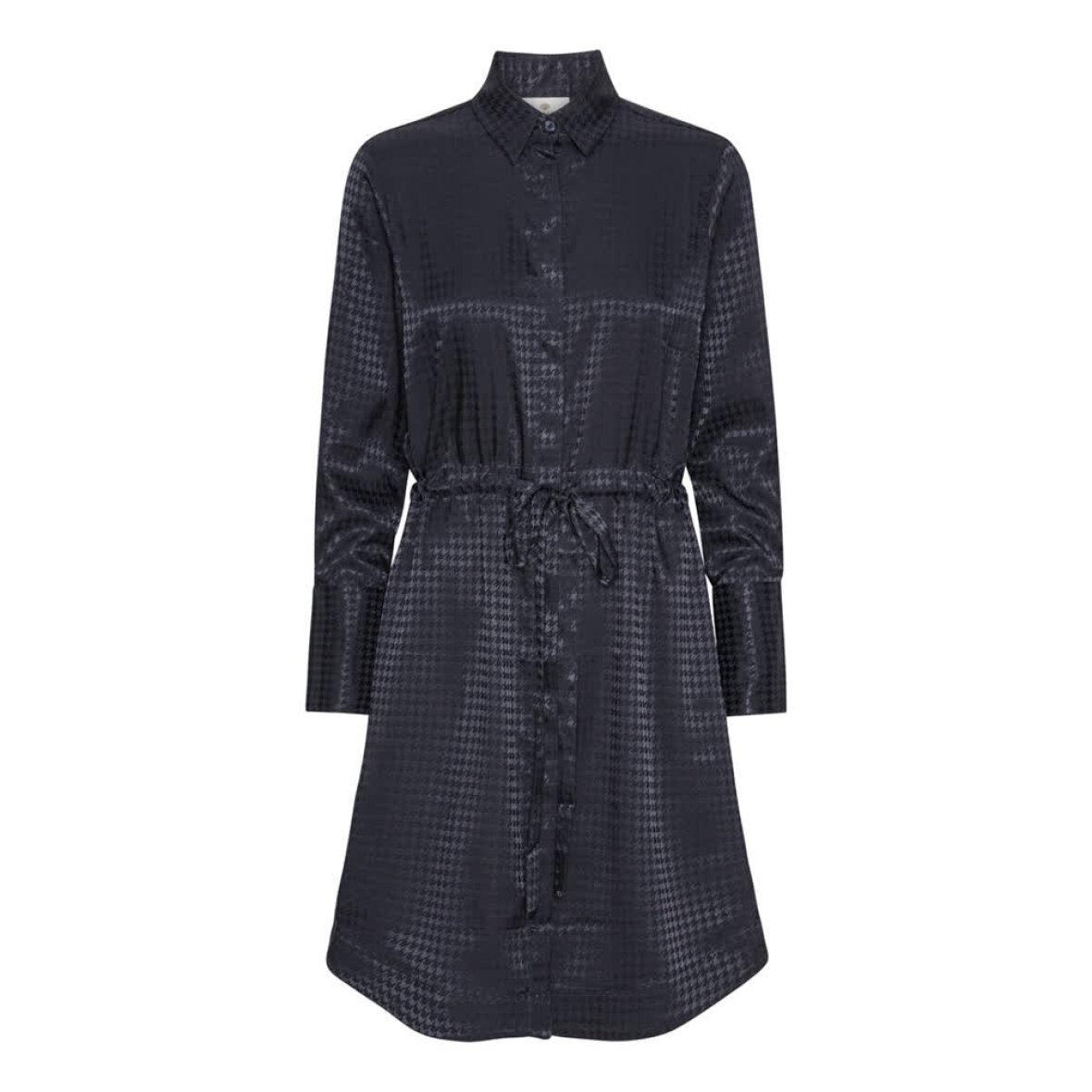 Den er gennemknappet med skjult knaplukning og har bindebånd i taljen.